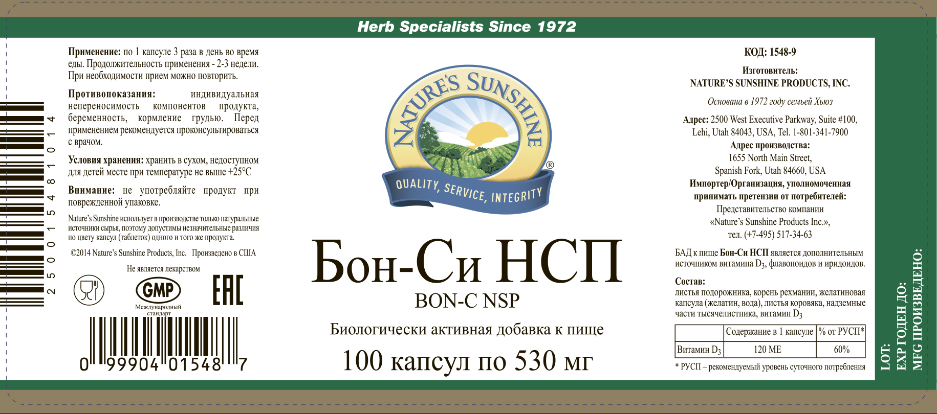 Бон-Си НСП оказывает противовоспалительное действие, показан при переломах, артрозах, привычных вывихах, кариесе и представляет собой комплекс, включающий: коровяк, подорожник, тысячелистник, рехманию, содержит витамин D3.